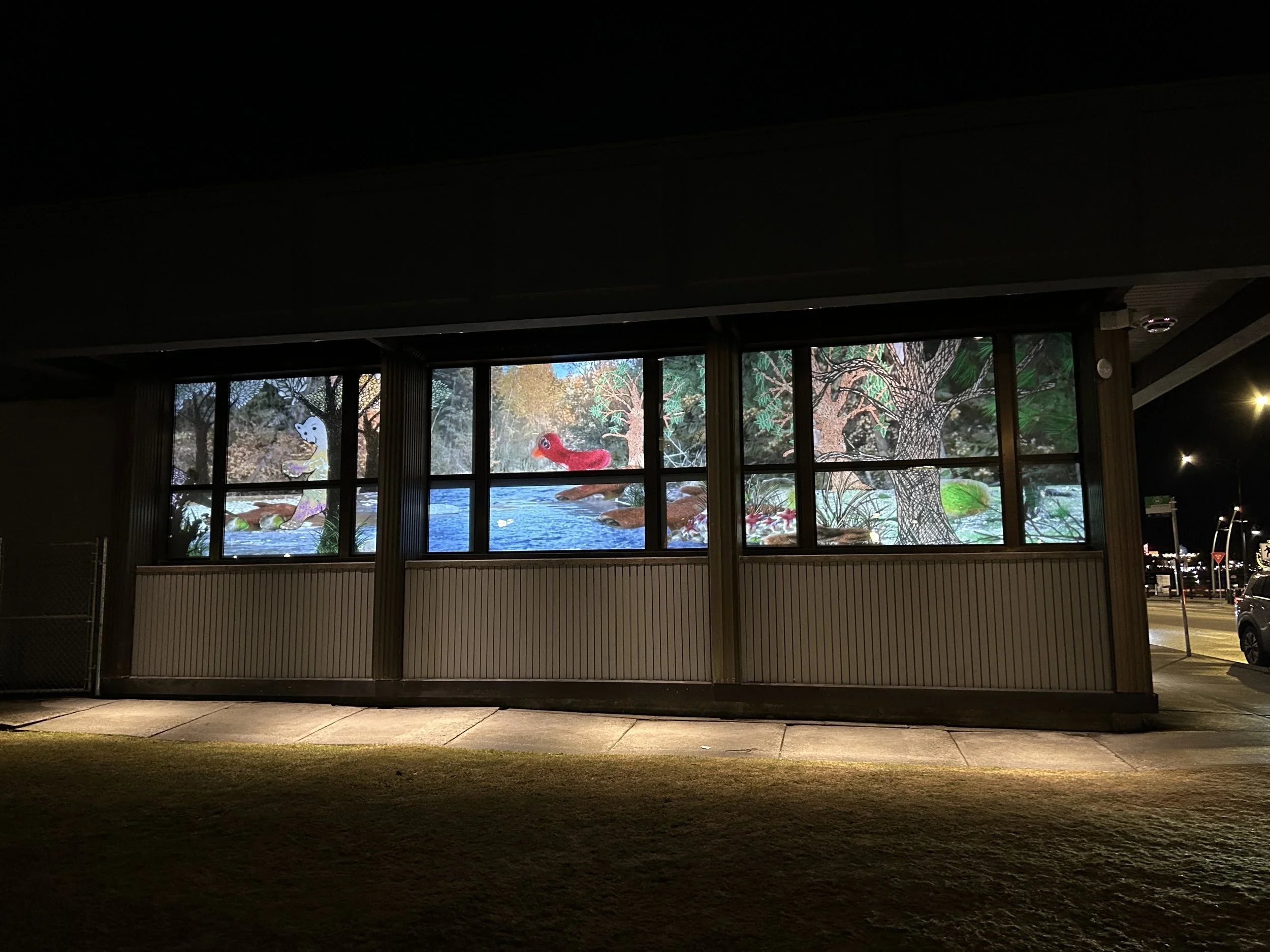 Vanishing Point, is an augmented reality piece, and animation and light projections collaboration created for Ebb and Flow, an exhibition at the Kelowna Art gallery, and for Light Up Kelowna, an outdoor exhibition that has our animation projected on the side of the Kelowna Community Theatre, and stencils of some of the imagery from the animation to create light projections along the Artwalk in downtown Kelowna.