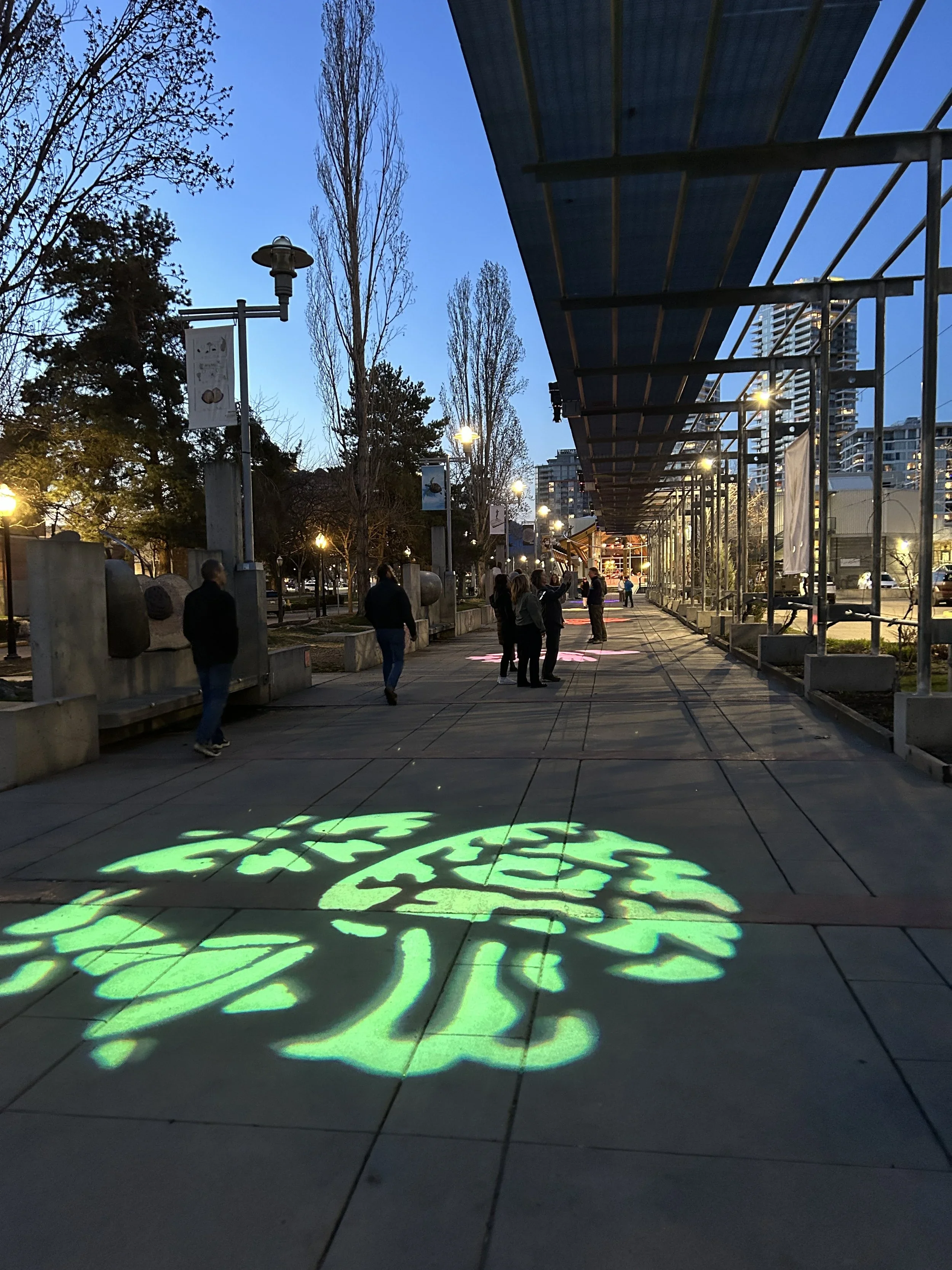 Art Walk is an ARTSCO project that uses GOBO lights and sound to activate an urban walkway between the Rotary Centre for the Arts and the Kelowna downtown library. For this Joanne & Shauna created silhouettes that represented images from our video and augmented reality works in Vanishing Point. Alison created 5 unique sound tracks to pair with each image projected on the walkway. Images and sound below.